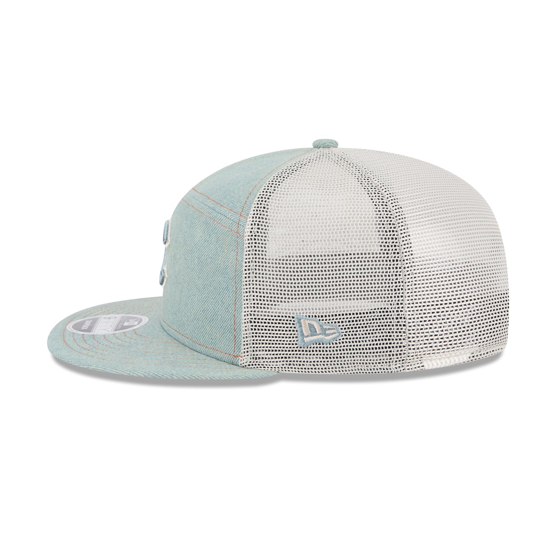 The Chicago Cubs Denim 9FIFTY Split Panel Trucker Hat features an embroidered Cubs logo at the front panels with an adjustable snapback closure at a mesh rear.