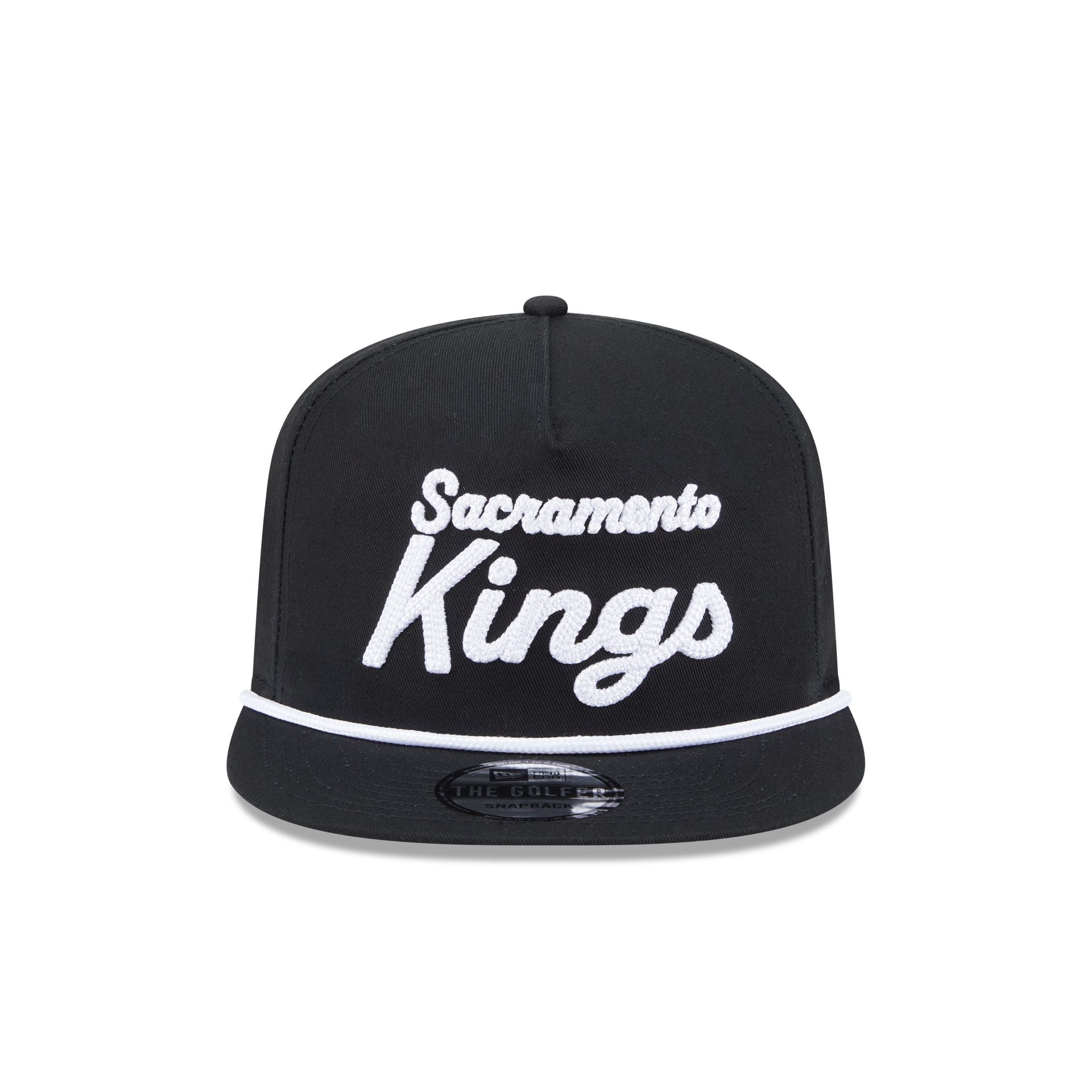 The Sacramento Kings Team Text Golfer features an embroidered Kings script at the front panels with a team logo at the right-wear side and a snapback closure at the rear.